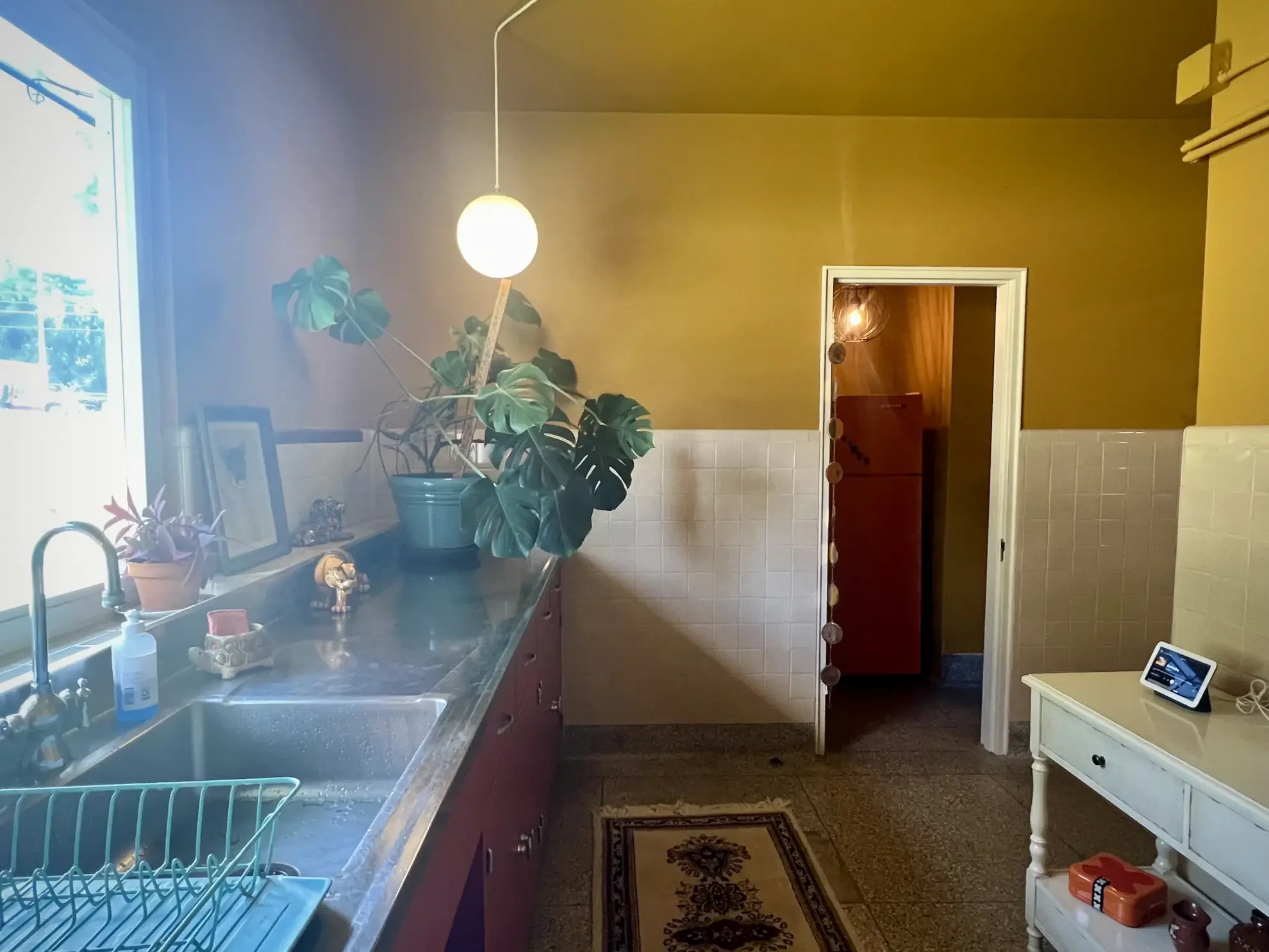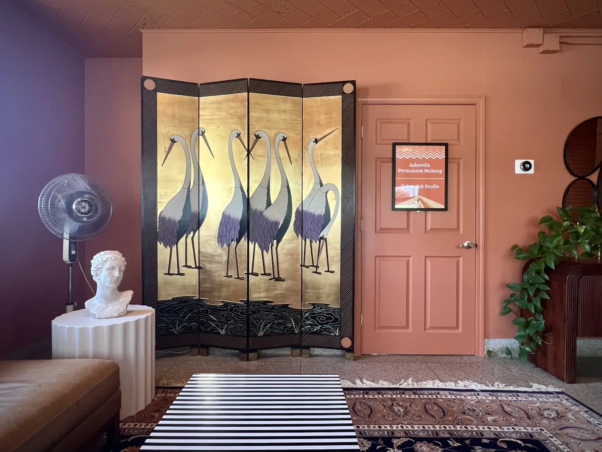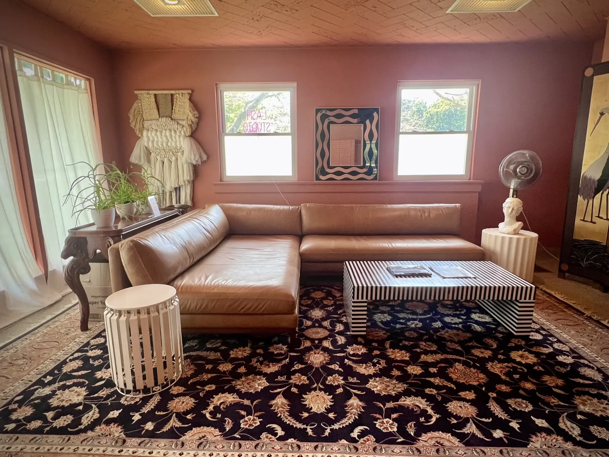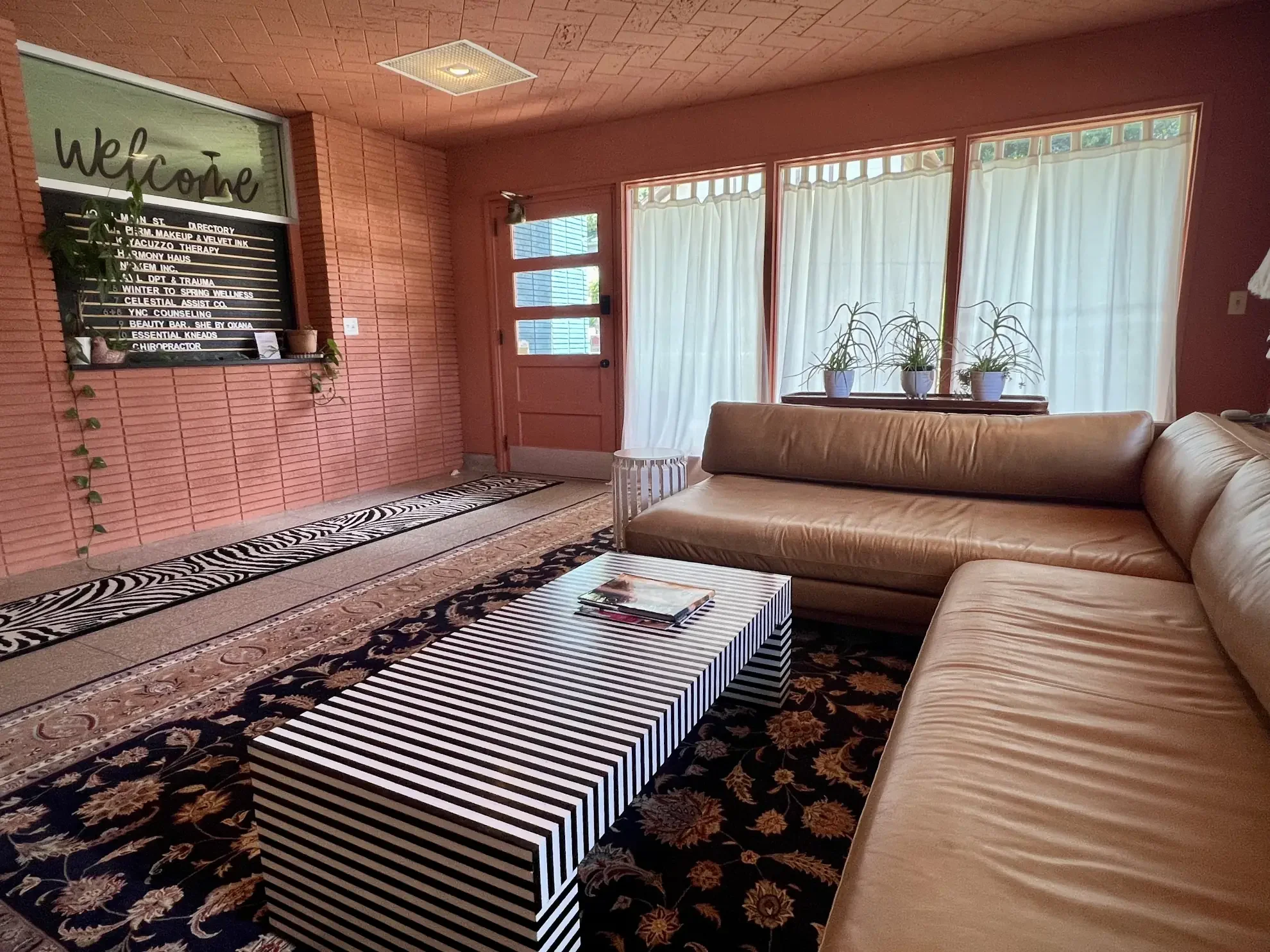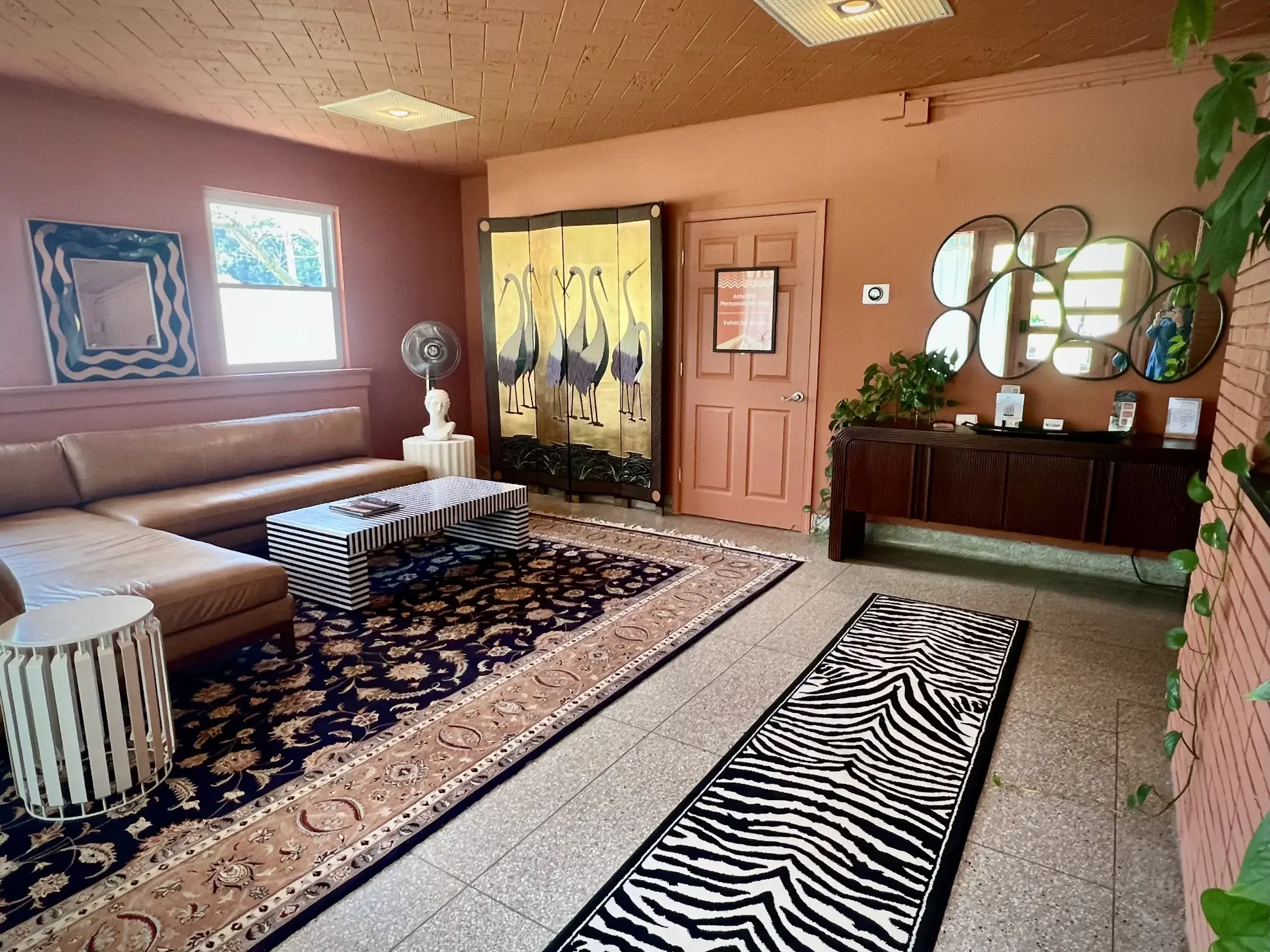 Calming, curated common areas blending vintage mid-century design with handcrafted art